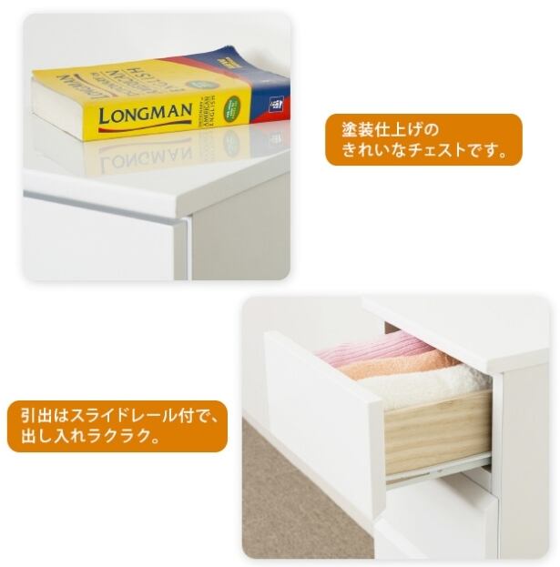 オーガナイザーボックスとして使える引き出しには、仕切り板が付いており、小物や下着などの整理整頓にも便利です。また、組立不要の完成品で、引出は重い物を入れても楽なレール仕様になっており、スムーズに開閉できるので使い勝手も抜群です♪